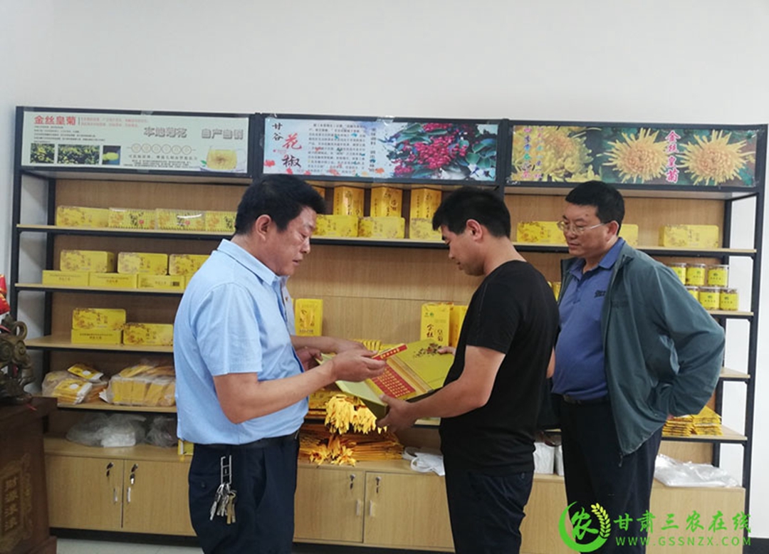 在万寿菊种植基地,甘谷县农业农村局张锐等人现场参与万寿菊开采仪式,亲自体验采摘活动,就万寿菊种植效益、销售、加工等环节与合作社负责人进行了详细交流,之后还实地查看了合作社的运营、药用菊加工包装设备。