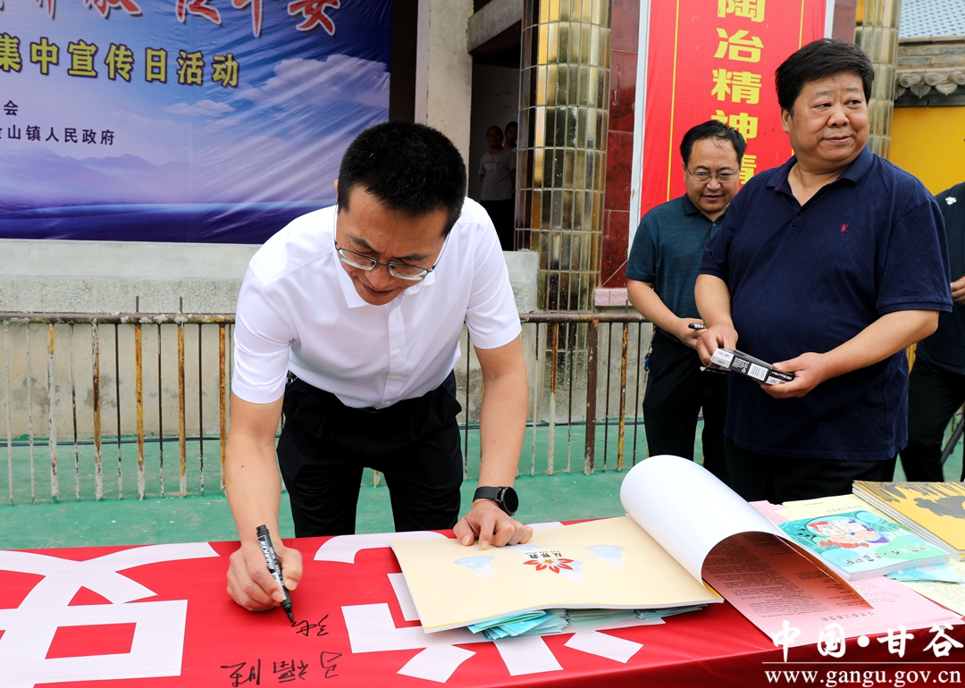 7月22日,甘谷县委政法委、县法院、检察院、公安局等部门在金山镇联合开展以“学党史、跟党走、反邪教、促平安”为主题的反邪教集中宣传日活动。县委常委、政法委书记马福胜,副县长、县公安局局长张涛,县法院院长王建军,县检察院检察长姜云出席活动,反邪教工作组各成员单位分管领导、各乡镇政法委员、金山镇镇村干部以及金山镇派出所、司法所人员共计400余人参加活动。