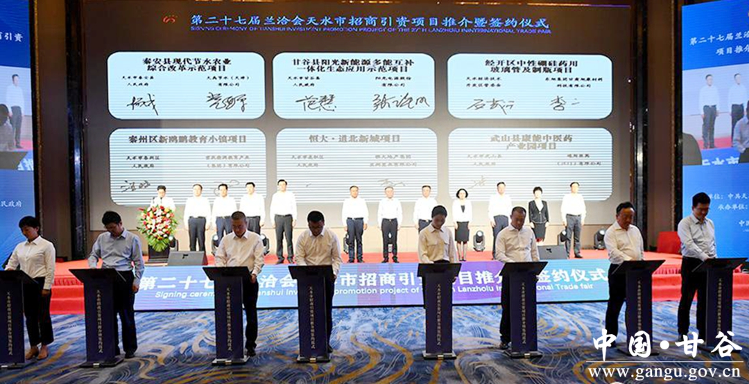 7月9日,第二十七届兰洽会天水市招商引资项目推介暨签约仪式在兰州举行。我市共签约高端装备产业园、OLED载板项目、新鸥鹏教育小镇、阳光新能源多能互补一体化生态应用项目、乡村振兴旅游项目等省外投资的合同项目58项,总投资935.13亿元。其中,甘谷县成功签约7项,总投资56.53亿元。