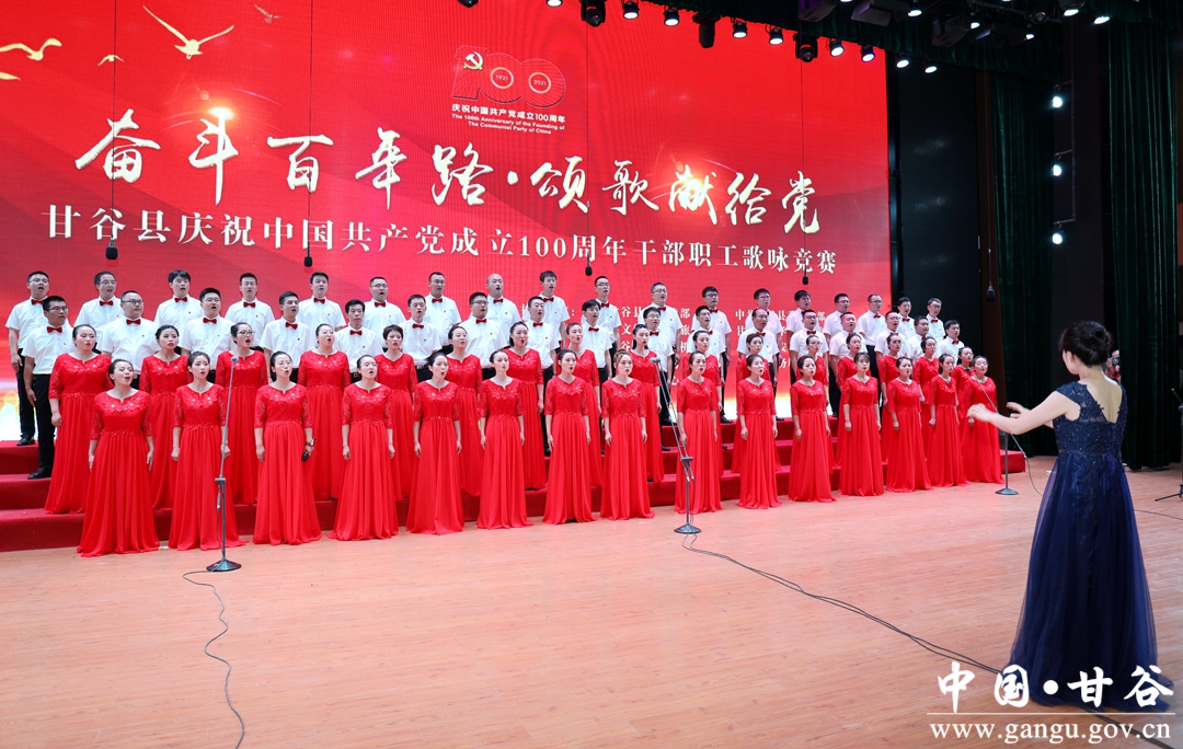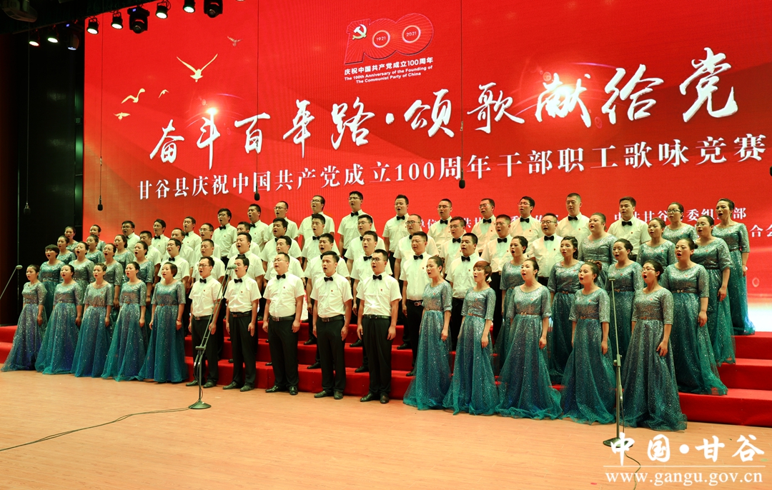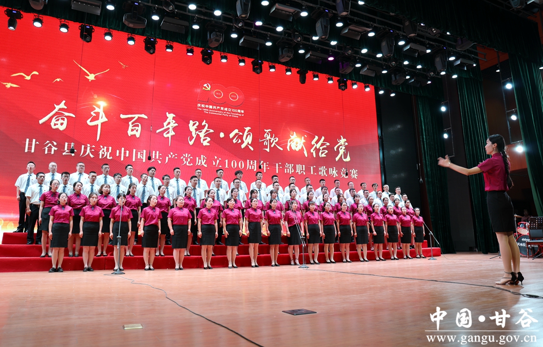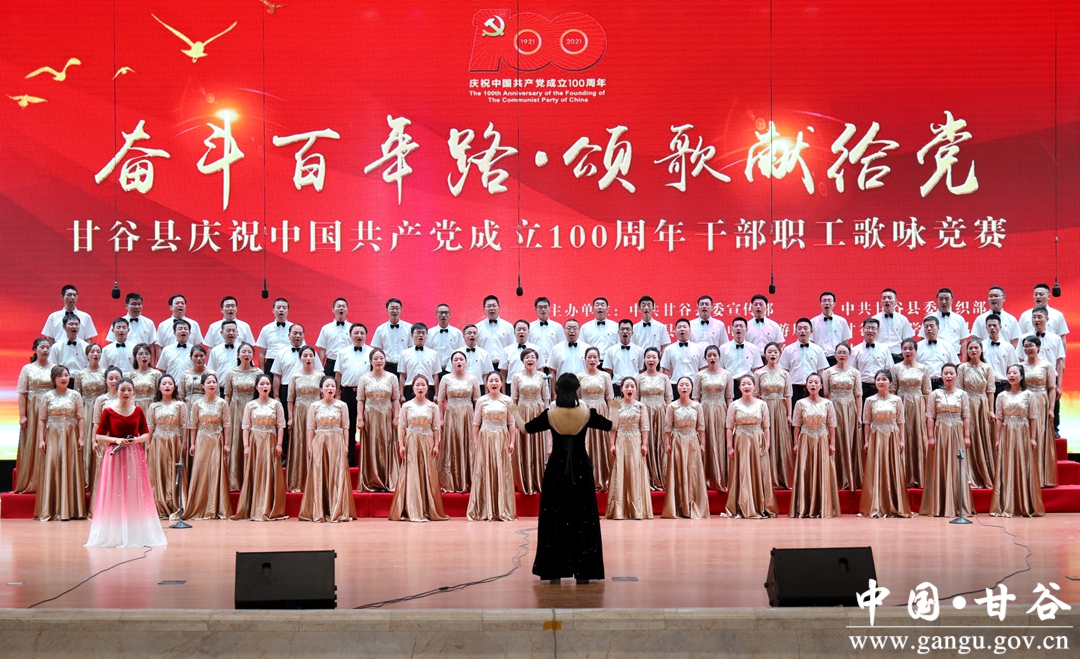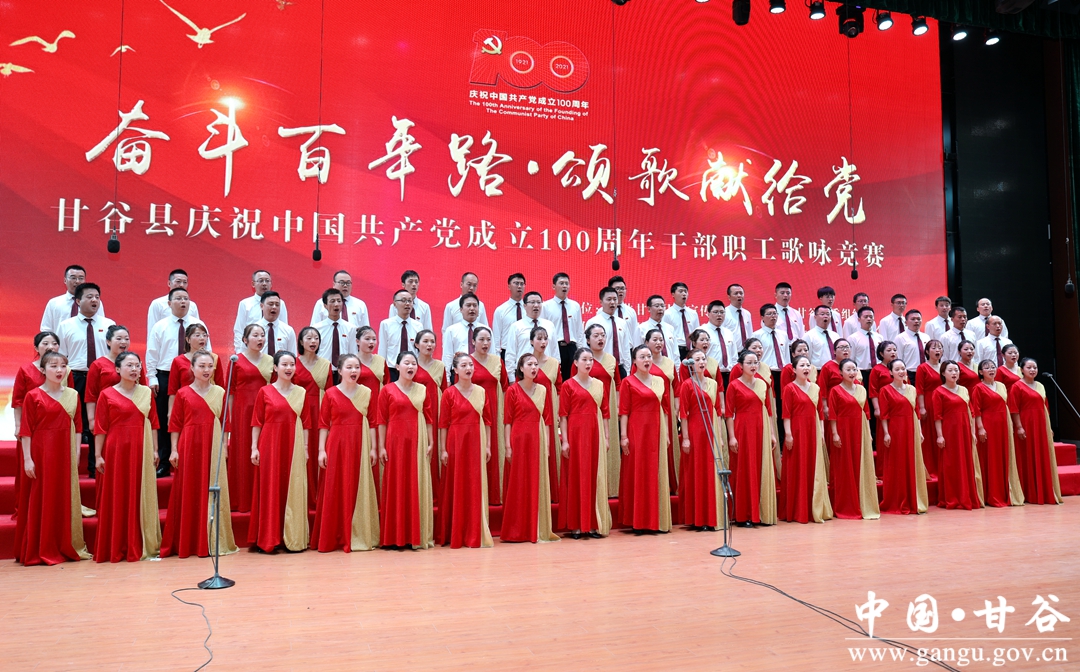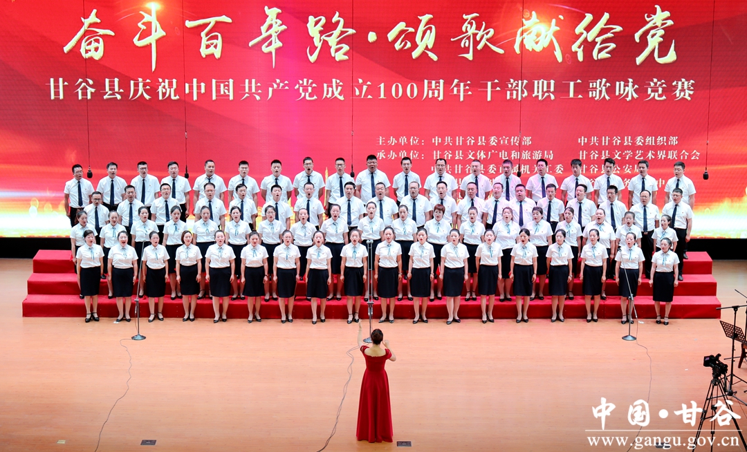 百年恰风华,世纪正青春,传承红色基因,赓续红色血脉;新时代,甘谷大地爱党爱国的主旋律薪火相传,64万甘谷儿女奋斗圆梦的精神生生不息。比赛现场,15支参赛队伍依次登台演唱,深情唱响《唱支山歌给党听》《我们走在大路上》《春天的故事》《在灿烂阳光下》等一首首脍炙人口、耳熟能详的经典歌曲,唱出了百年大党的风华正茂、新时代中国的朝气蓬勃,全面彰显了全县党员干部对党的无限忠诚、对祖国的无比热爱。