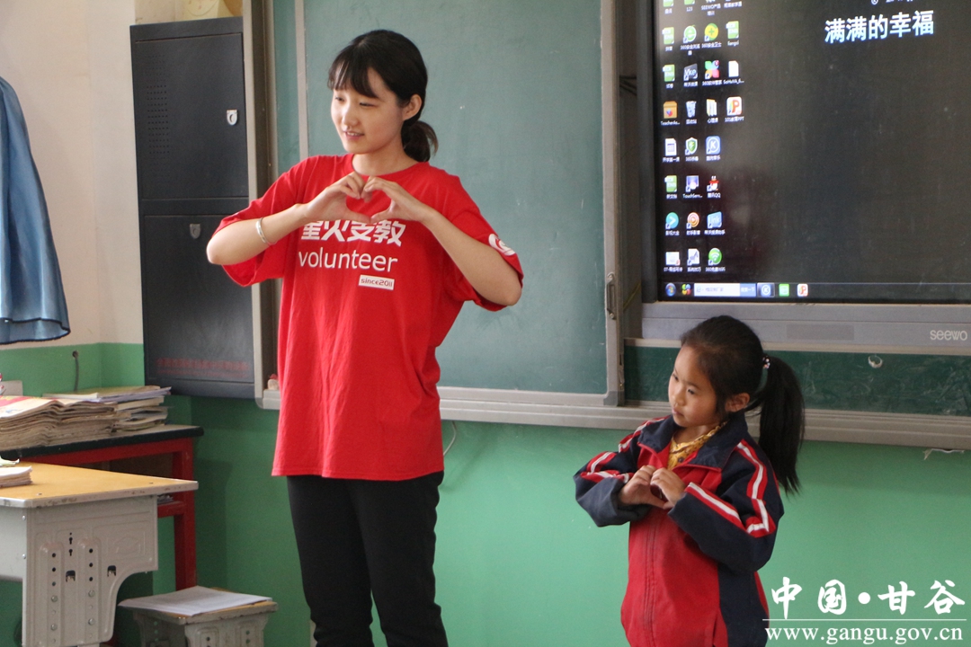 在甘谷县磐安镇四十铺小学,志愿者们正在给同学们上课,他们灵活多样的授课方式和精彩的课堂讲解,让孩子们在快乐中收获了知识。六年级学生石洁茹说,老师们上课教得非常认真,而且也特别的和蔼,我们在一起的时光非常的快乐,非常的开心。