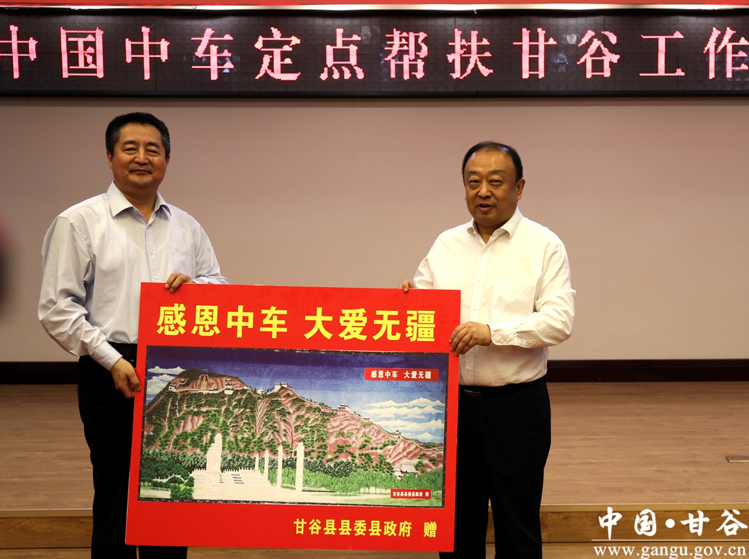 在召开的中国中车定点帮扶甘谷座谈会上,县委副书记、县长吴健汇报了中车集团帮扶甘谷县工作情况,副县长李兰平、县政府党组成员庞新志进行了发言,中车集团向甘谷捐赠了50万元帮扶资金,甘谷县向中车集团回赠了腾达扶贫车间制作的挂毯礼品。