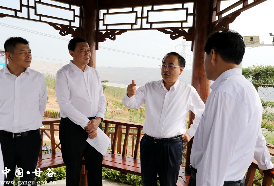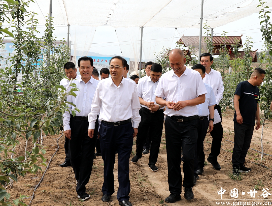 (在磐安镇张家沟村矮化密植园调研) 孙永才一行深入磐安镇张家沟村矮化密植园,通过实地查看、听取汇报、座谈交流等方式,详细了解了我县巩固拓展脱贫攻坚成果、接续推进乡村振兴产业发展情况。孙永才强调,产业是发展的根基,是脱贫的主要依托。甘谷县要始终把脱贫攻坚巩固提升作为乡村振兴的重中之重,全力做好脱贫后与乡村振兴的有效衔接,进一步调整优化农业产业结构,发展现代特色农业,促进产业兴旺,因地制宜、因势利导,做大做强特色产业,拓展产品销售渠道,“以销促产”促进贫困地区产业健康发展,精准带动更多群众稳定脱贫致富,实现农业转型升级,推动农民收入再上新台阶。