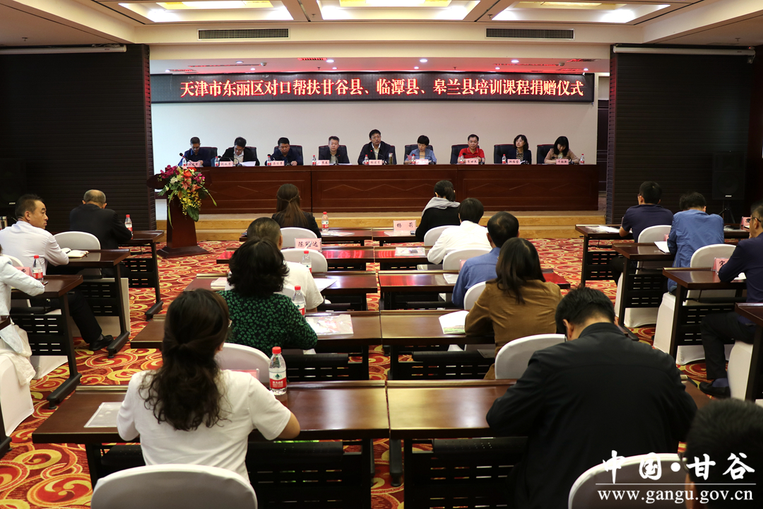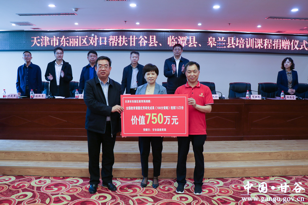 捐赠仪式上,天津市东丽区分别向对口帮扶县皋兰县、临潭县、甘谷县捐赠了价值350万元、400万元、750万元的课程培训,天津市东丽区英华学校向甘谷县教育局捐赠了价值11.286万元的校服。