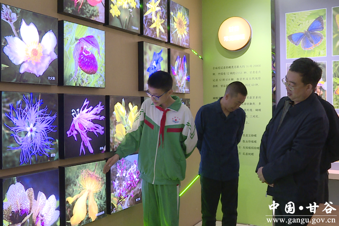 走进自然博物馆,最中心位置摆放的花朵、树木、蝴蝶、飞鸟等自然标本,是学校通过举办最美植物采集和自然观察笔记大赛,引导学生走进身边的大自然采集的植物标本,浓缩了甘谷本土的自然之美。