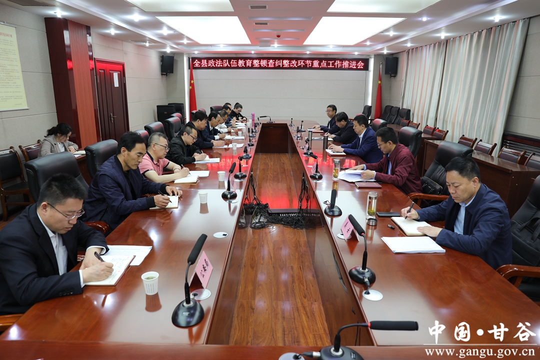 会上,学习传达了《陈一新:政法队伍教育整顿当前要重视解决“六个苗头性问题”》、《全国政法队伍教育整顿领导小组办公室关于有关问题和建议的答复意见》、宣读了《关于全省第一批政法队伍教育整顿第一轮〈自查事项报告表〉填报情况的通报》、《督办通知》《全国政法队伍教育整顿中央第十五督导组甘肃小组抄告单》,通报了全市、全县政法队伍教育整顿查纠整改环节有关情况,安排了近期全县政法队伍教育整顿查纠整改环节重点工作。