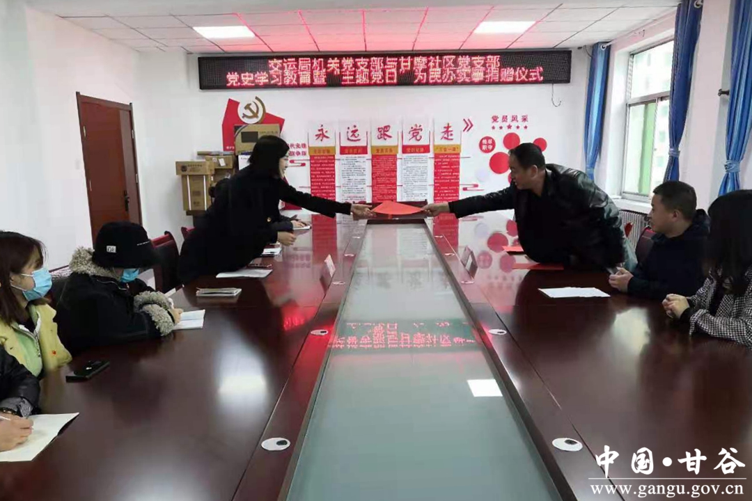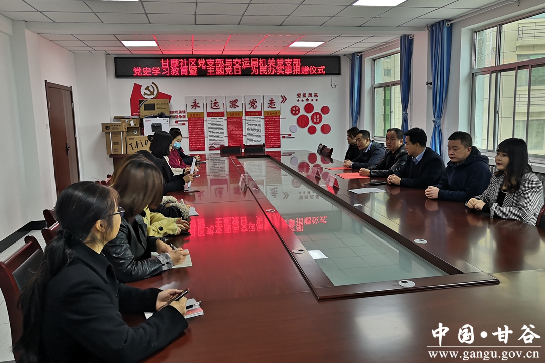 4月2日,甘谷县交通运输局在新兴镇甘摩社区举行“党史学习教育暨主题党日为民办实事物资捐赠仪式”,向结对共建单位新兴镇甘摩社区党支部捐赠价值1.5万余的办公物资。县交通运输局党组书记、局长罗小将、党总支书记、副局长程仲林及机关支部部分党员、新兴镇党委副书记、镇长杨琪及甘摩社区党员群众代表共20余人参加捐赠仪式。