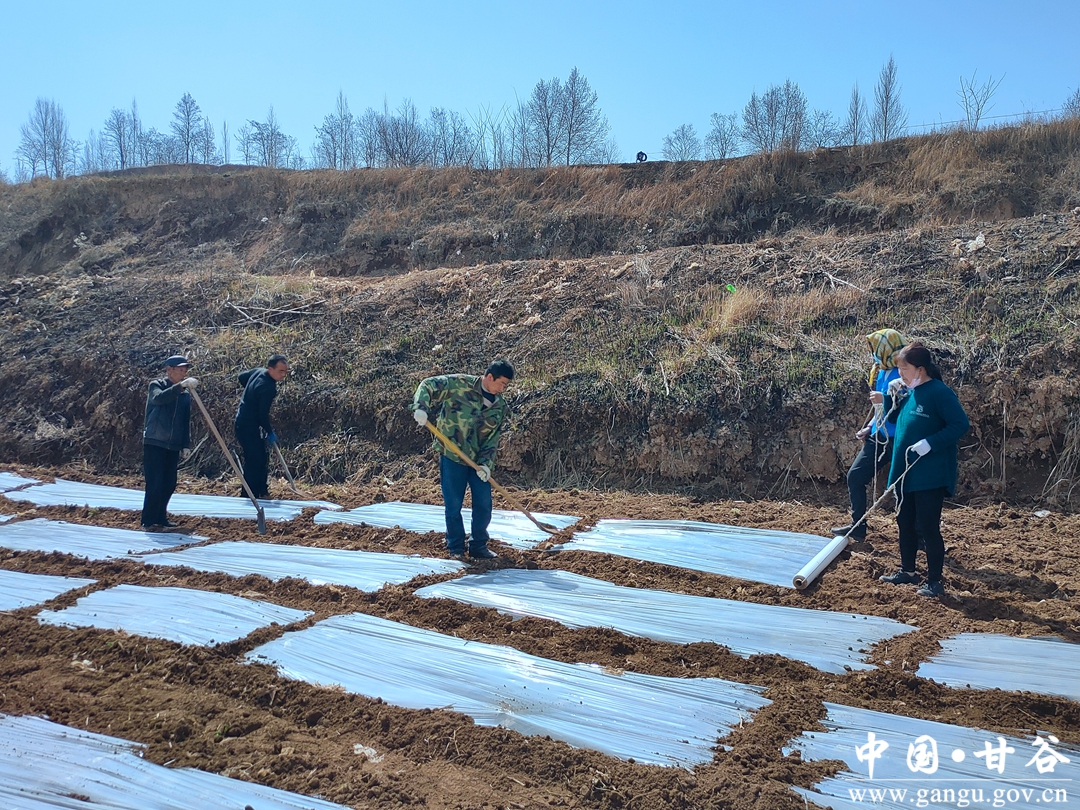 中岔村前程农民专业合作社负责程随喜说,正值春耕生产,我村依托合作社,采用党支部+合作社+农户的模式,抢抓墒情,正在顶凌铺膜。