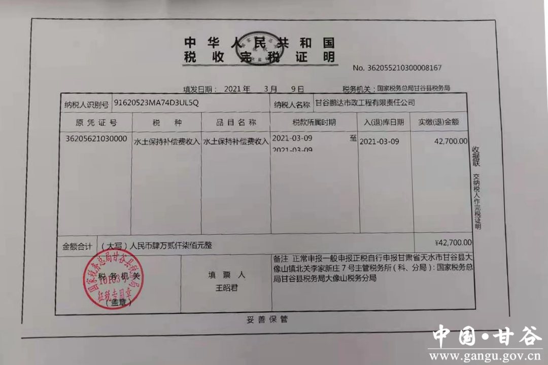 3月9日,甘谷鹏达市政工程有限公司第一分公司在国家税务总局甘谷县税务局办税大厅足额缴纳水土保持补偿费4.27万元。这标志着甘谷县生产建设项目水土保持补偿费划转至税务部门征收工作的正式启动实施。