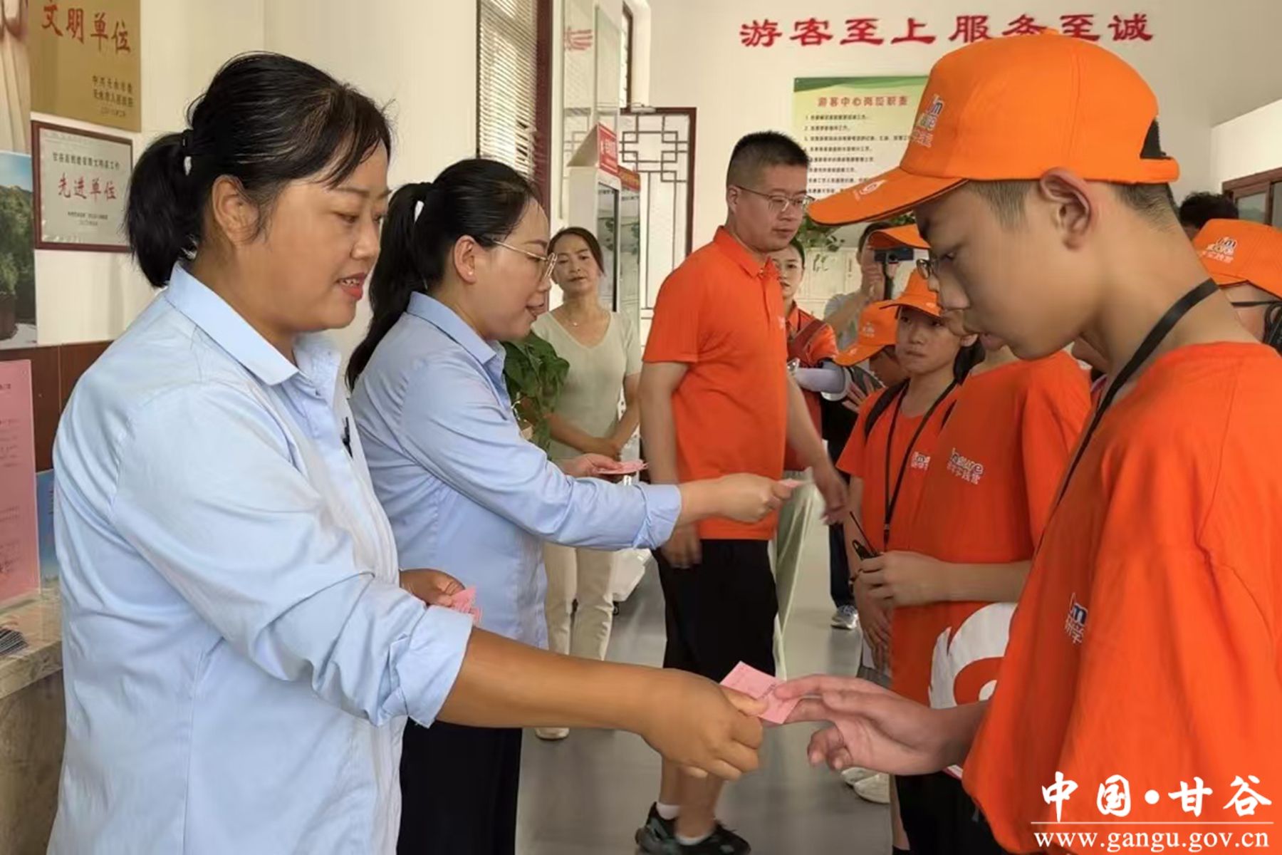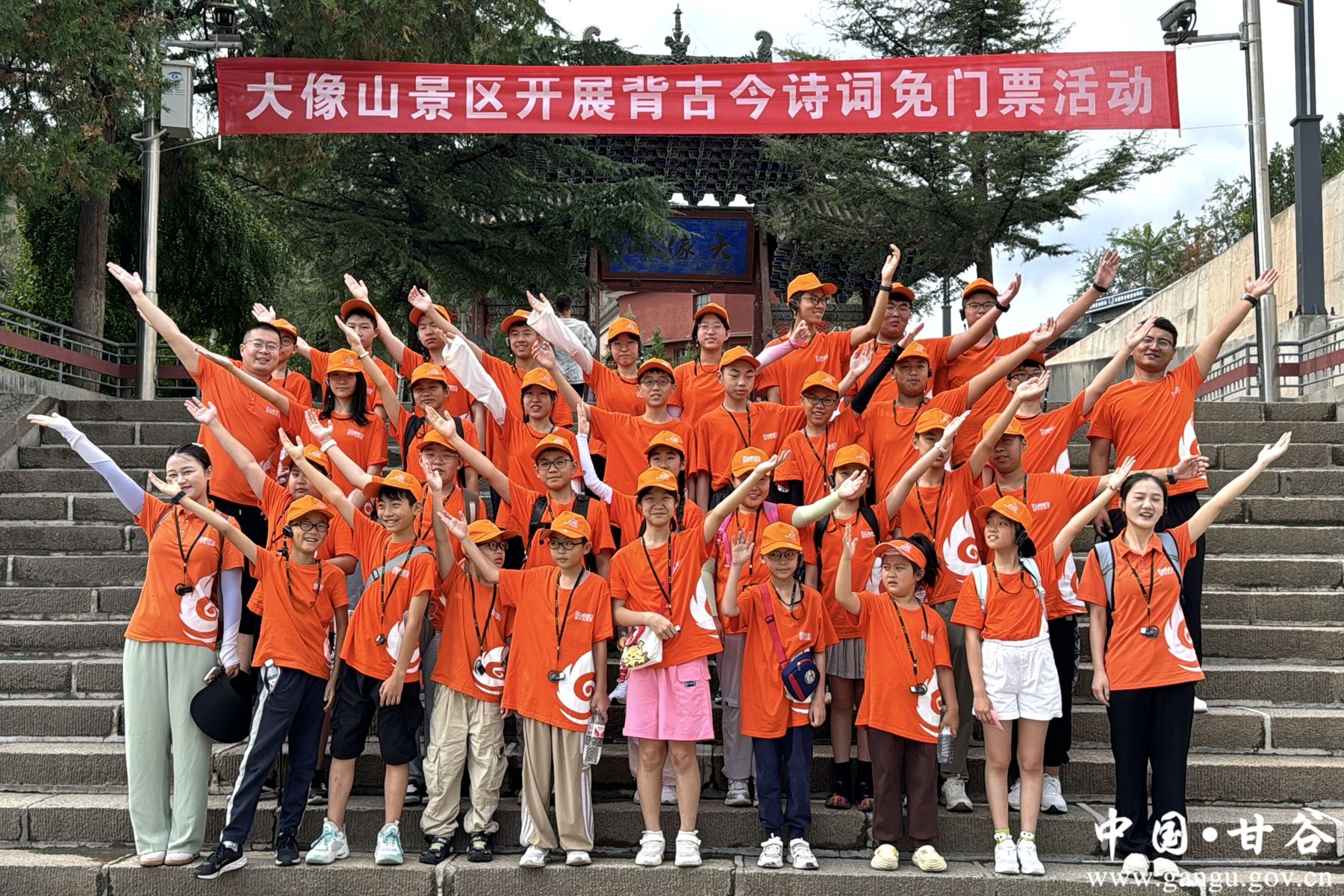 暑期正酣,每天来甘谷旅游的人络绎不绝。在大像山景区游客服务中心,记者看到来自江苏省徐州市的一个研学团队的学员们,正在排队依次背诵诗词。