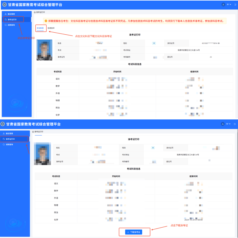 5.选择“文化科目”、“信息技术”下载对应的准考证。