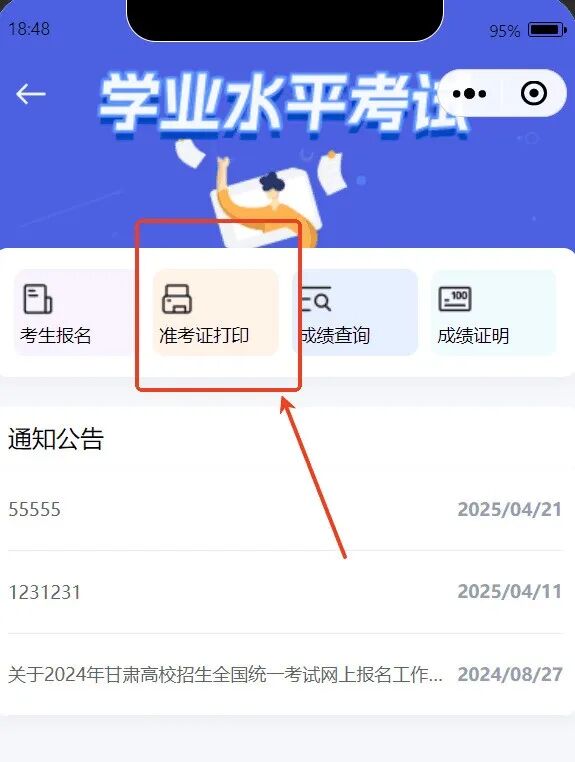 2025年冬季甘肃省普通高中学业水平合格性考试将于11月29日-30日举行(信息技术科目机试于11月21-23日举行),为确保考生方便、快捷打印准考证,顺利应考,现将2025年冬季甘肃省普通高中学业水平合格性考试准考证打印(信息技术科目机试准考证须单独打印)相关事宜公告如下: