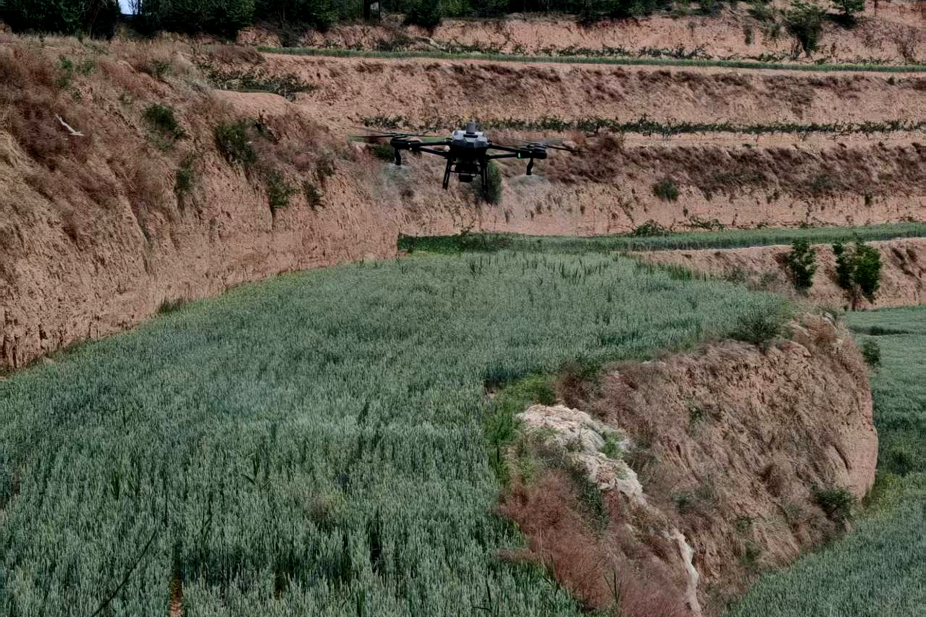 在席家局千亩冬小麦示范基地,科技元素成为最大亮点。植保无人机在技术人员的操控下腾空而起,沿着预设航线精准作业。旋翼带起的微风拂过绿浪翻滚的麦田,雾化药剂均匀洒落在麦穗上,短短一小时就完成了近百亩麦田的飞防作业。村民席保太赞叹道:“以前人工打药要忙活好几天,现在无人机一会儿就搞定了,既省时又省力!”