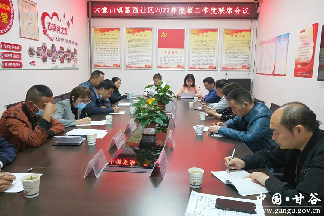 为全面落实加强党建引领,提高社区治理水平,充分发挥社区党组织领导核心作用,推动辖区共建单位与社区治理同频共振,努力实现“共治、共建、共管、共享”工作目标,2022年9月14日,大像山镇富强社区党委按照甘谷县委组织部和大像山镇党建办有关要求,组织召开以“党建引领抓治理,全民助力同创城”为主题的第三季度联席会议。