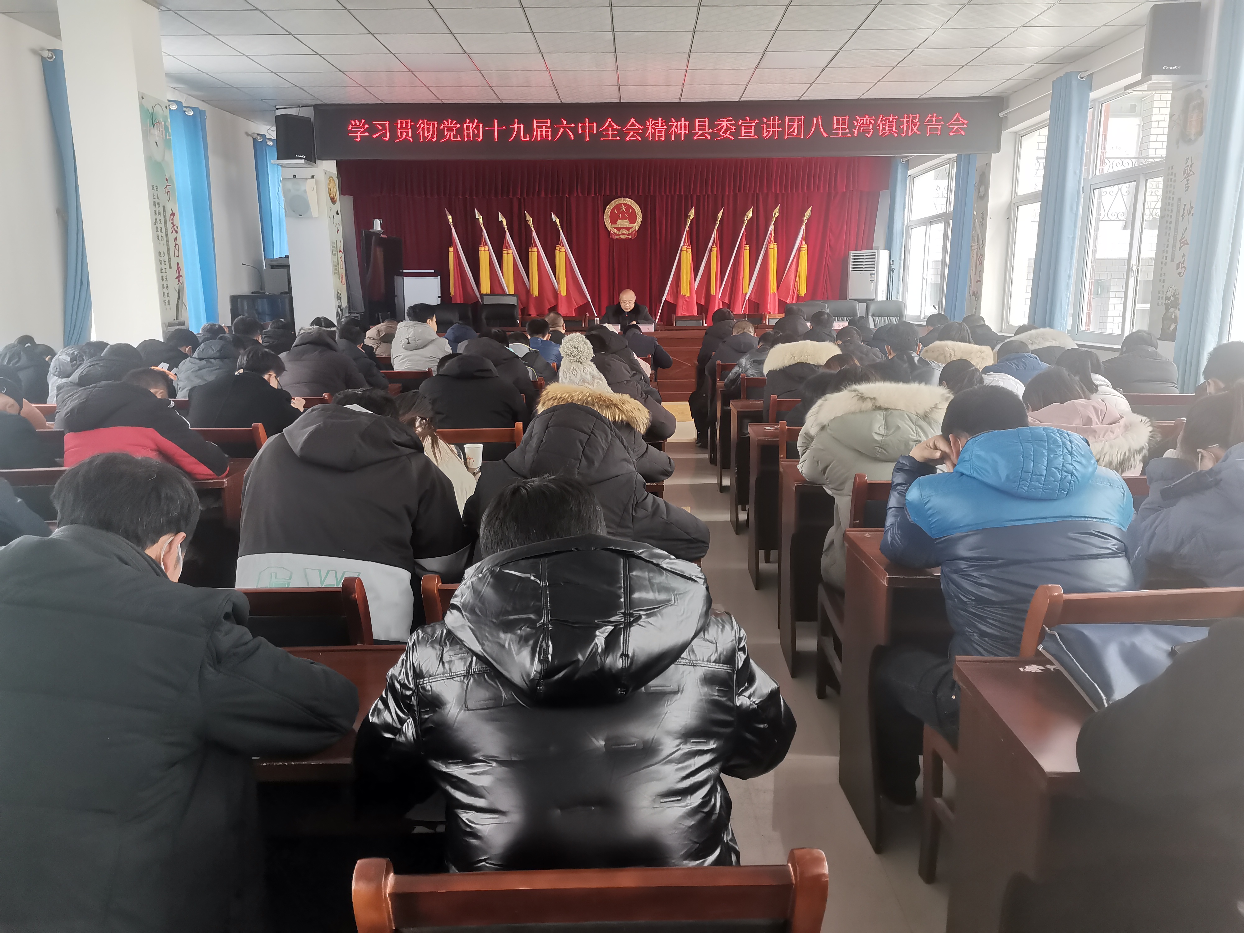 12月31日,县政协副主席蒋文深入八里湾镇宣讲党的十九届六中全会精神,八里湾镇全体干部、各村党支部书记、文书共计130余人聆听了宣讲。