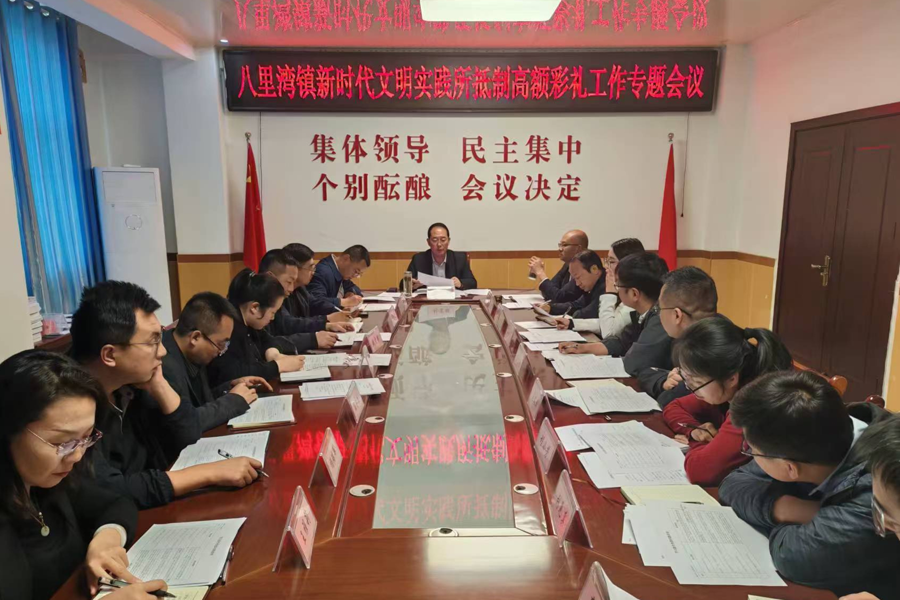 党委统领强保障,构建高效工作体系。将抵制高额彩礼作为深化乡风文明建设、推进乡村振兴的重要切口。高位谋划部署:镇党委召开专题会议,深入剖析本地婚俗现状、高额彩礼危害及根源,研究制定并印发《八里湾镇抵制高额彩礼推进移风易俗工作实施方案》。健全组织机制:成立由党政主要领导挂帅的专项工作领导小组,明确职责分工,压实镇村两级责任主体,构建起“党委领导、政府负责、实践所站(所)抓落实、群众参与”的上下贯通、齐抓共管工作格局,为行动开展提供坚强组织保障。