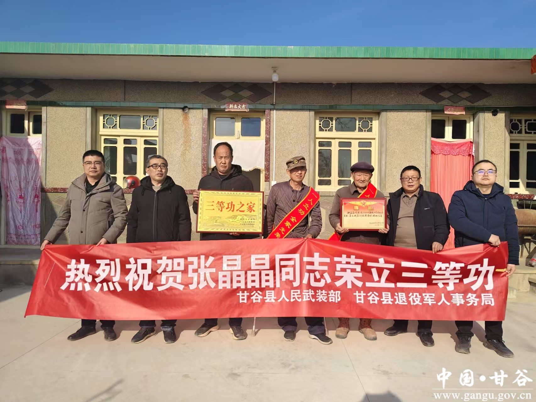 得知张晶晶荣立三等功,隔壁邻居纷纷赶来道贺,现场热闹非凡,甘谷县退役军人事务局工作人员在村民的欢呼和掌声中来到张晶晶家里,为军属送上“三等功之家”牌匾,披挂上“一人立功,全家光荣”绶带,将三等功喜报送到家属手中,并送上慰问金和慰问品。