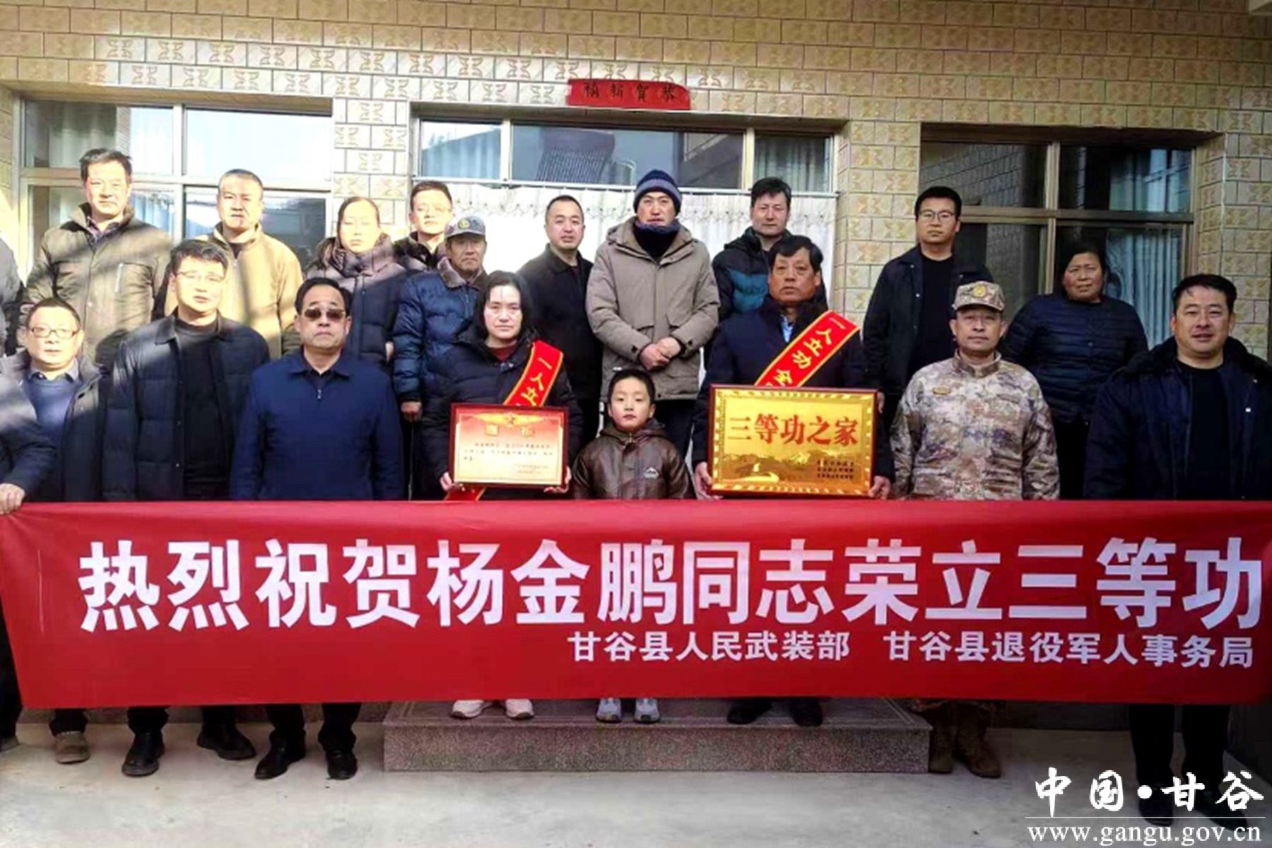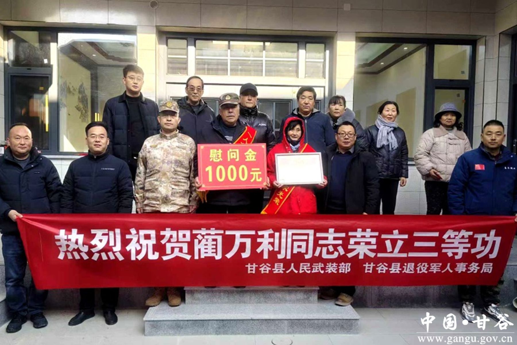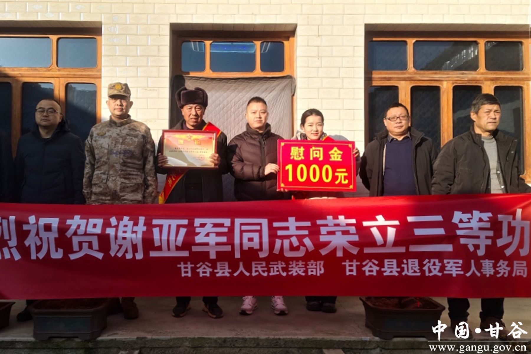 为进一步弘扬拥军优属的光荣传统,增强军人军属的荣誉感和自豪感,近日,县退役军人事务局联合县人武部及相关乡镇退役军人服务站,赴新兴镇、谢家湾乡、安远镇、大庄镇4个乡镇,为荣立三等功的现役军人家庭送去立功受奖喜报,在新年伊始为军属送上党和政府的关怀。