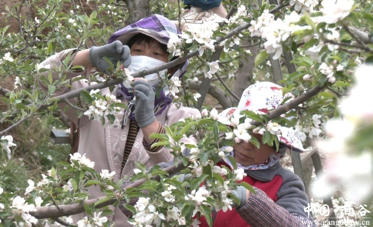 新甘谷讯【记者 王永吉】四月春回暖,繁花次第开。连日来,甘谷县白家湾乡的5.2万亩苹果园迎来盛花期,粉白相间的苹果花如云似雪缀满枝头,果农们穿梭于花海之中,忙着疏花定果,为全年的苹果丰收打下坚实基础。