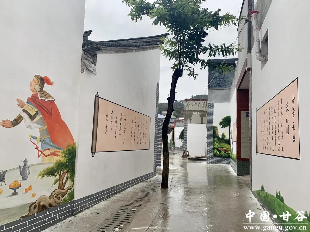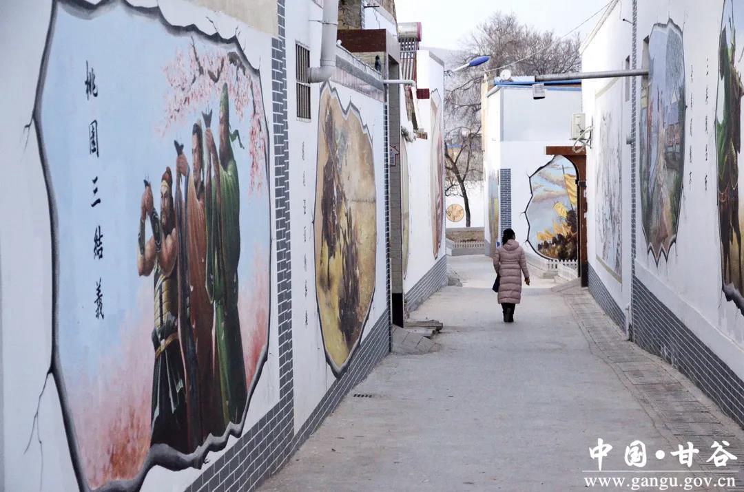此时,落日的余晖洒在甘谷县六峰镇姜家庄村姜维祠巍峨的殿宇之上,洒向姜家庄村青瓦白墙错落有致的农家小院间,一幅幅栩栩如生的三国文化彩绘,伴随着爷孙俩夕阳中移动的“剪影”,在干净整洁的村中小道两旁,徐徐铺展开来。