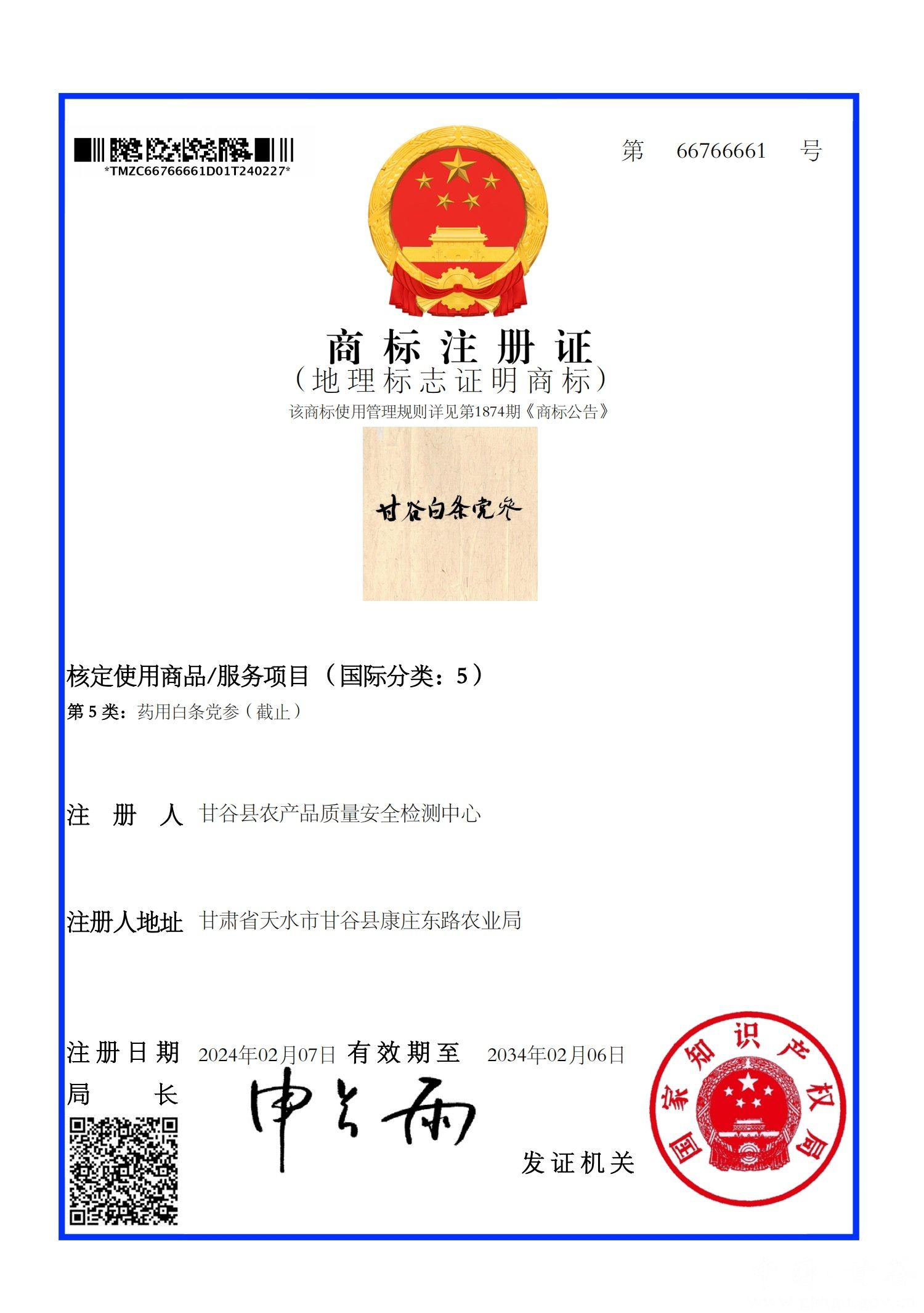 近日,从国家知识产权局传来喜讯,由甘谷县农产品质量安全检测中心申报的“甘谷白条党参”地理标志证明商标成功注册,该商标的专有权有效期为2024年02月7日至2034年02月6日。这是自2018年机构改革以来,我县成功申报注册的第2件地理标志证明商标,也是全市申报注册的第2件地理标志证明商标。目前,我县累计注册地理标志证明商标7件。