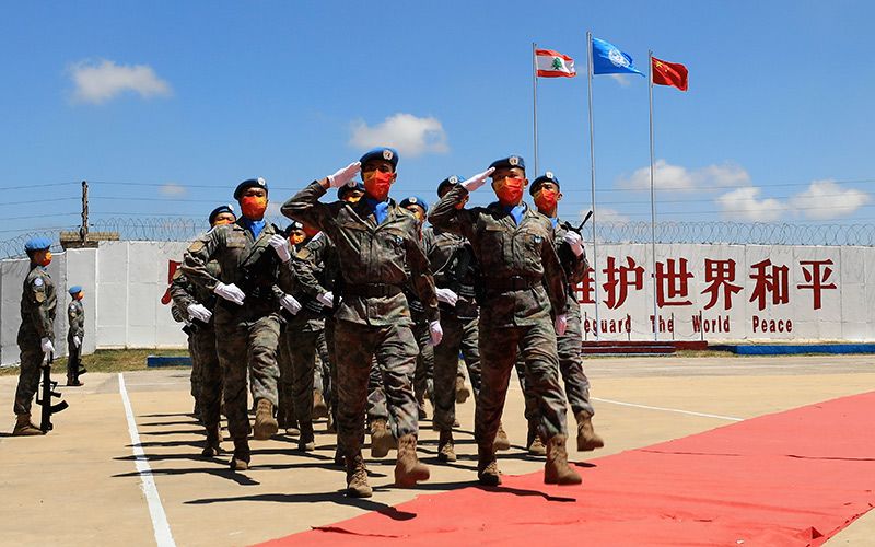 在黎巴嫩南部辛尼亚村的中国维和部队营区,中国维和部队官兵在受勋后通过观礼台(2022年7月1日摄)。新华社记者 刘宗亚 摄