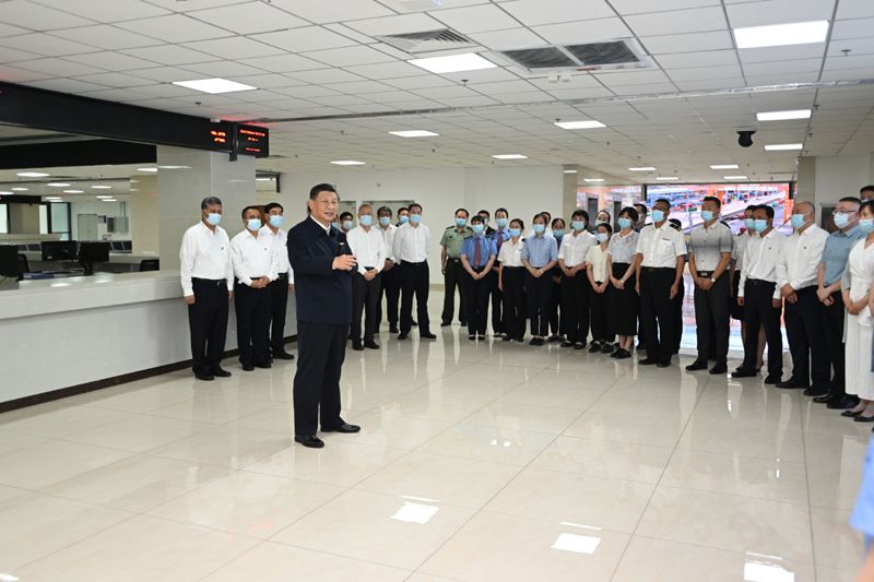 7月12日至15日,中共中央总书记、国家主席、中央军委主席习近平在新疆考察。这是12日下午,习近平在乌鲁木齐国际陆港区,同工作人员及现场办事人员亲切交流。新华社记者 谢环驰 摄