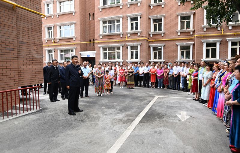 7月12日至15日,中共中央总书记、国家主席、中央军委主席习近平在新疆考察。这是13日上午,习近平在乌鲁木齐市天山区固原巷社区考察时,同各族群众亲切交流。新华社记者 谢环驰 摄