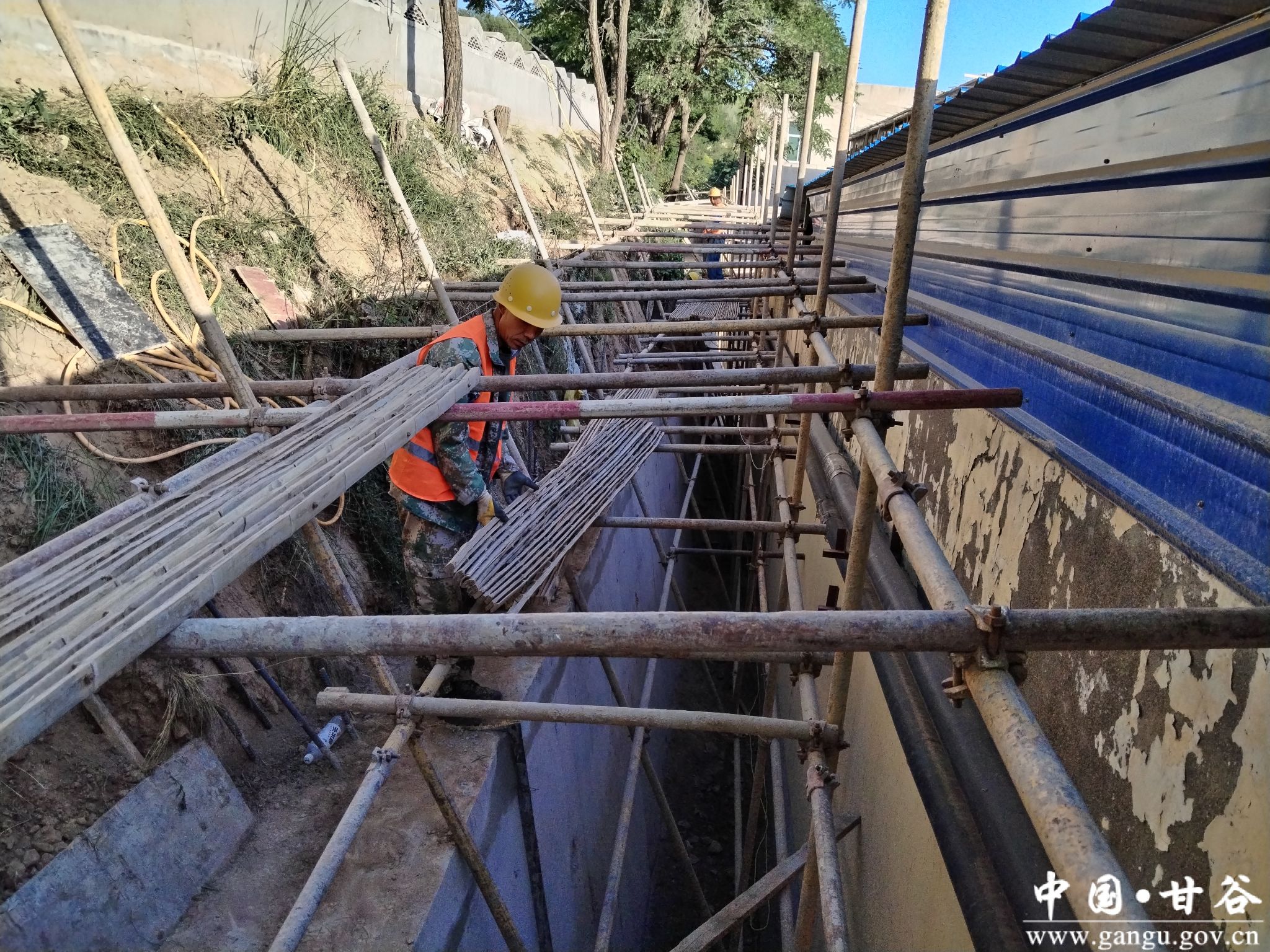炎炎夏日,谢家湾梁上却是一派凉爽气象。在乡政府院内,不稳定斜坡治理现场,工人们正在有条不紊的搭建钢架、支设模板,全长129米的不稳定斜坡,最下面的一段商砼已经浇筑,不同区段按照施工计划也在加快推进。