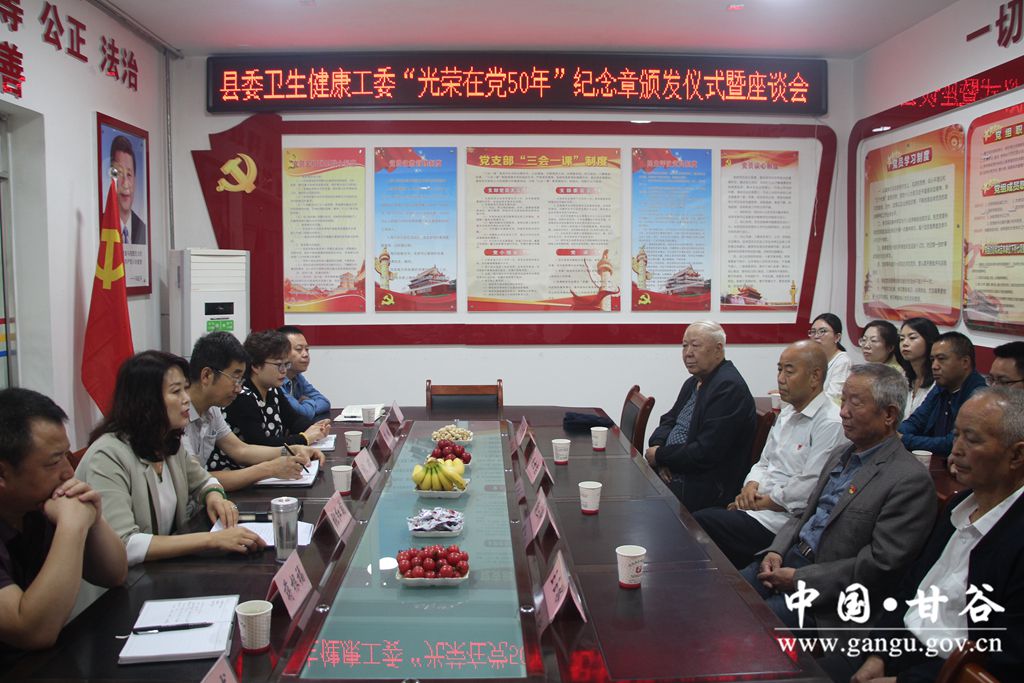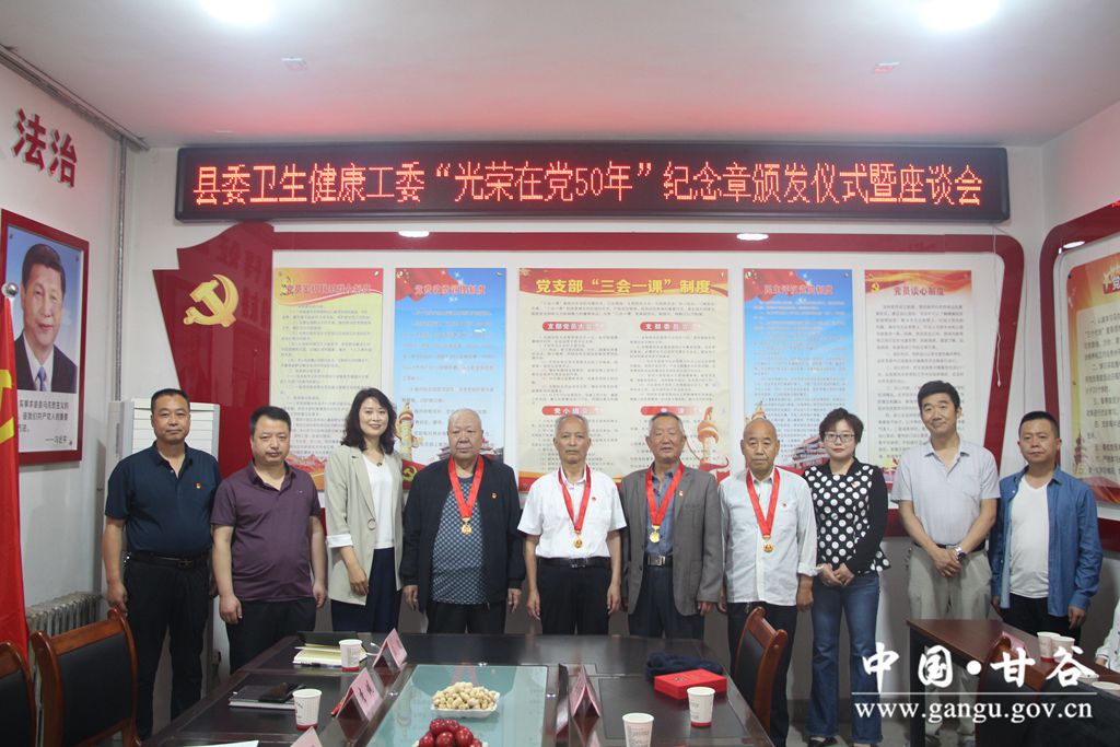 为庆祝中国共产党成立100周年,6月16日上午,县委卫生健康工委举行了“光荣在党50年”纪念章颁发仪式暨座谈会,为党龄50年以上的老党员颁发“光荣在党50年”纪念章。县委卫生健康工委书记、局长张红菊主持并讲话,卫健局党组班子成员、4名“光荣在党50年”纪念章颁发对象代表、5名2021年新党员代表参加仪式。