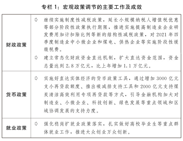 二是保持宏观政策连续性针对性。宏观政策适应跨周期调节需要,保持对经济恢复必要支持力度,同时考虑为今年应对困难挑战预留政策空间。积极的财政政策提质增效、更可持续。保持必要的财政支出规模,地方政府专项债券发行使用管理进一步优化,建立常态化财政资金直达机制,将2.8万亿元中央财政资金纳入直达范围,及时为基层保基本民生、保工资、保运转提供财力支持。全年新增减税降费为市场主体减负超过1万亿元。对制造业中小微企业、煤电和供热企业实施阶段性缓缴税费。货币政策灵活精准、合理适度,灵活运用降准、再贷款、再贴现等多种政策工具,两次全面降准,流动性保持合理充裕,广义货币供应量(M2)余额和社会融资规模存量分别增长9%和10.3%。加大对实体经济、重点领域和薄弱环节的支持力度,企业综合融资成本稳中有降,全年新增人民币贷款19.95万亿元,比上年多增3150亿元,大型商业银行普惠小微企业贷款增幅超过40%,企业贷款平均利率为4.61%,比上年下降0.1个百分点。强化稳岗扩就业政策落实,扎实做好高校毕业生等重点群体就业工作,推进大众创业万众创新。