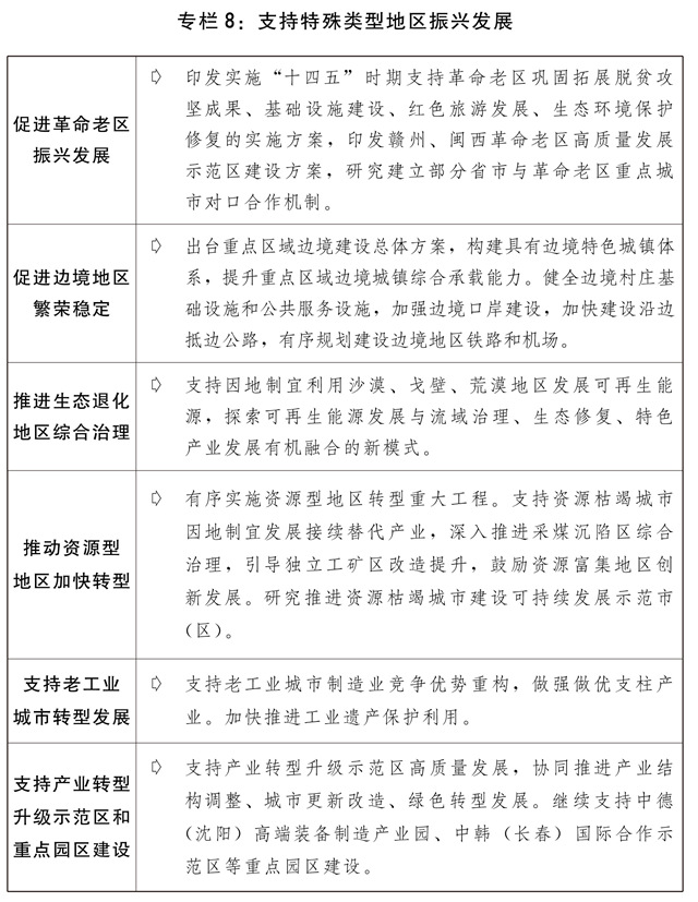 二是提高区域协调发展水平。推动西部大开发形成新格局,发挥风、光、水电和矿产资源优势建设大型清洁能源基地。积极发展文化和旅游产业。实施重要生态系统保护和修复工程,加快重大项目规划建设。推进贵州大数据综合试验区建设。积极稳妥推进雅鲁藏布江下游水电开发等重大工程。推动东北振兴取得新突破,组织实施好东北全面振兴“十四五”实施方案,继续推进黑瞎子岛中俄国际合作示范区建设,积极推动大小兴安岭林区生态保护与经济转型,稳步推进长吉图开发开放先导区发展,推动《东北振兴重点项目三年滚动实施方案》重点项目加快建设。推动中部地区高质量发展,推动湘鄂赣协同高质量发展,支持晋陕豫黄河金三角承接产业转移示范区建设,支持山西进一步深化能源革命综合改革试点,推进淮海合作区协同发展,支持中国(武汉)光谷建设,编制出台洞庭湖生态经济区规划。鼓励东部加快高质量发展,支持福建高质量发展及平潭综合实验区建设,推动山东新旧动能转换综合试验区建设取得新进展。支持民族地区改善生产生活条件,加强各民族交流交往交融,铸牢中华民族共同体意识。推动革命老区、边境地区、生态退化地区、资源型地区、老工业城市等特殊类型地区振兴发展,推进国家级新区、临空经济示范区、承接产业转移示范区等功能平台建设,推动国家自主创新示范区和高新区高质量发展。支持海洋经济发展示范区、现代海洋城市等建设,提升海洋资源开发利用水平。
