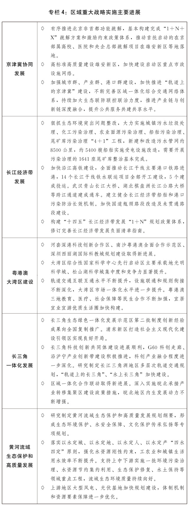一是区域重大战略深入实施。北京非首都功能疏解取得新突破,国务院印发《关于支持北京城市副中心高质量发展的意见》,雄安新区进入大规模建设阶段,落实支持天津滨海新区高质量发展的意见,张家口首都水源涵养功能区和生态环境支撑区加快建设。长江经济带生态优先、绿色发展深入推进,生态环境突出问题整改和污染治理“4+1”工程稳步推进实施,生态环境系统保护修复成效明显,长江十年禁渔实现良好开局,水生生物资源逐步恢复,沿江综合交通运输体系加快构建,长江保护法正式实施。粤港澳大湾区建设稳步推进,中共中央、国务院印发《横琴粤澳深度合作区建设总体方案》、《全面深化前海深港现代服务业合作区改革开放方案》,基础设施和公共服务融合有序开展。长三角一体化发展深入推进,基础设施互联互通水平持续提升,一体化发展体制机制不断优化,中共中央、国务院印发《关于支持浦东新区高水平改革开放 打造社会主义现代化建设引领区的意见》,构建长三角世界级港口群形成一体化治理体系、共建虹桥国际开放枢纽等重大任务有力推进,生态绿色一体化发展示范区建设取得显著成效。“十四五”黄河流域生态保护和高质量发展实施方案印发,农业、工业、城镇生活和尾矿库污染“3+1”综合治理方案扎实推进,污染防治、生态保护修复、深度节水控水、水土保持等领域重大工程项目稳步实施,在黄河省区完成1.2万平方公里水土流失治理任务。
