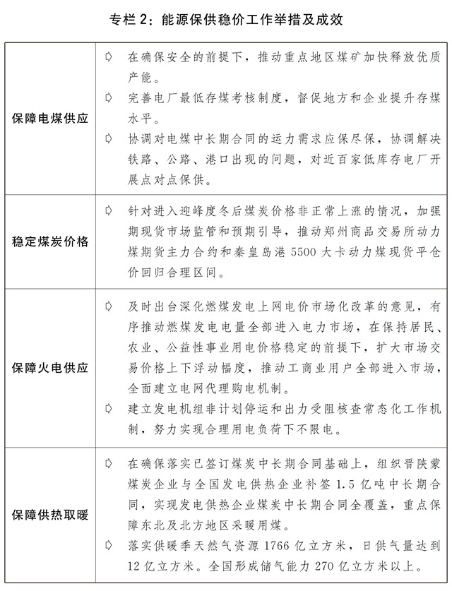 三是粮食能源等重要资源保供稳价工作有力有效。针对玉米、煤炭、铁矿石、铜铝锌等大宗商品价格异常波动,及时采取供需双向调节、期现货市场联动监管、预期引导等措施,打出保供稳价的政策组合拳,有力促进了价格回归合理区间。加强粮食市场调控,合理安排进口和政策性粮食库存销售,有效保障粮食市场稳定供应。加强期货市场监管和新棉收购引导,适时增加中央储备棉投放,促进棉花市场平稳有序运行。着力解决煤炭电力供应紧张问题,推动煤炭增产增供和价格回归合理水平,支持发电供热企业纾困解难,提升煤电支撑保障能力,改革完善煤电价格市场化形成机制,扩大市场交易价格上下浮动幅度,加强煤炭、液化天然气(LNG)等能源物资产运需衔接和运输保障,确保民生和公共用能需求,推进全社会节约用电。发挥跨部门协调工作机制作用,做好化肥市场保供稳价工作。制定实施原材料价格上涨应对方案以及分品种保供稳价工作方案。发挥国家储备市场调节作用,分批投放原油成品油和铜铝锌等国家储备。