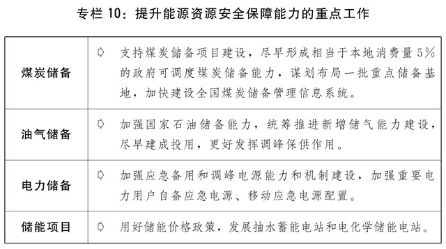 二是提升能源资源安全保障能力。深入推进煤电油气产供储销体系建设。推进石油储备重大工程建设,加快华北、西北等地下储气库新建和扩容达容建设。有序核增一批煤炭先进产能,加快提升煤炭储备能力。加强抽水蓄能等调峰电源建设,继续发挥传统能源特别是煤炭、煤电的兜底保供和调峰作用,积极推进现有煤电项目改造升级。推进白鹤滩、羊曲等重大水电工程建设。加大力度规划建设以大型风光电基地为基础、以其周边清洁高效先进节能的煤电为支撑、以稳定安全可靠的特高压输变电线路为载体的新能源供给消纳体系。加快推进国家储备建设,健全统一的战略和应急物资储备体系。