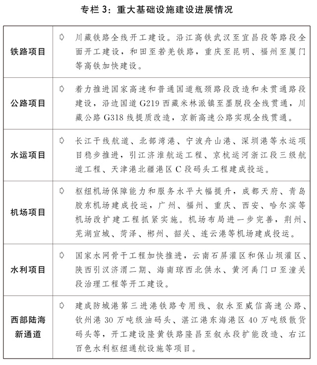 四是适度超前开展重大基础设施建设。精准有效推进交通、水利、物流、能源、新型基础设施、民生等领域重大基础设施项目建设。推进川藏铁路、西部陆海新通道、沿江高铁、一批铁路专用线重点项目和川藏公路G318线提质改造等加快建设。整体推进京津冀、长三角、粤港澳大湾区城市群城际铁路、市域(郊)铁路建设。鼓励推广轨道交通+土地综合开发模式经验。做好中长期铁路网、国家公路网和全国港口与航道布局规划修编,强化国家公路、港口和高等级航道网络功能。推动三峡水运新通道研究论证。实施国家水网重大工程。加快发展公铁水多式联运。提升枢纽机场综合保障能力和服务水平,加快培育支线航空市场,提高国际航空货运能力。加快“支点城市+骨干走廊”现代流通网络建设。稳步推进国家物流枢纽、国家骨干冷链物流基地建设,强化冷链运输环节疫情防控措施,完善“321”冷链物流运行体系。加快物流业制造业融合创新发展,积极推动多式联运、智慧物流等新业态新模式发展。布局一批新型基础设施项目,加快推进5G、千兆光网、一体化大数据中心、北斗产业化重大工程、民用空间基础设施等建设,推动传统基础设施智能化改造。