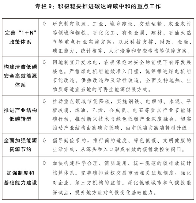二是积极稳妥推进碳达峰碳中和。完善碳达峰碳中和“1+N”政策体系,实施“碳达峰十大行动”,坚持“全国一盘棋”。大力发展非化石能源,建设大型风电、光伏基地项目,积极发展分布式新能源,积极推动海上风电集群化开发,稳妥推进西南等地大型水电基地建设,大力发展抽水蓄能,在确保绝对安全的前提下积极有序发展核电,推进煤炭清洁高效利用。提升电网对可再生能源发电的消纳能力。做好全国碳排放权交易市场第二个履约周期管理。实施节能降碳改造升级。积极研究开发碳捕捉利用与封存技术。优化完善能耗双控政策,合理增加能耗总量弹性,新增可再生能源和原料用能不纳入能源消费总量控制,推动能耗“双控”向碳排放总量和强度“双控”转变。全面加强能源资源节约,强化工业、交通和建筑节能,不断降低单位产出能耗物耗和碳排放。对标能效标杆水平,推动能效低于基准水平的重点行业企业,有序实施改造升级,促进高耗能行业高质量发展。继续做好碳达峰碳中和及应对气候变化国际谈判与合作,主动参与全球绿色治理体系建设,加强绿色经贸、技术与金融合作。