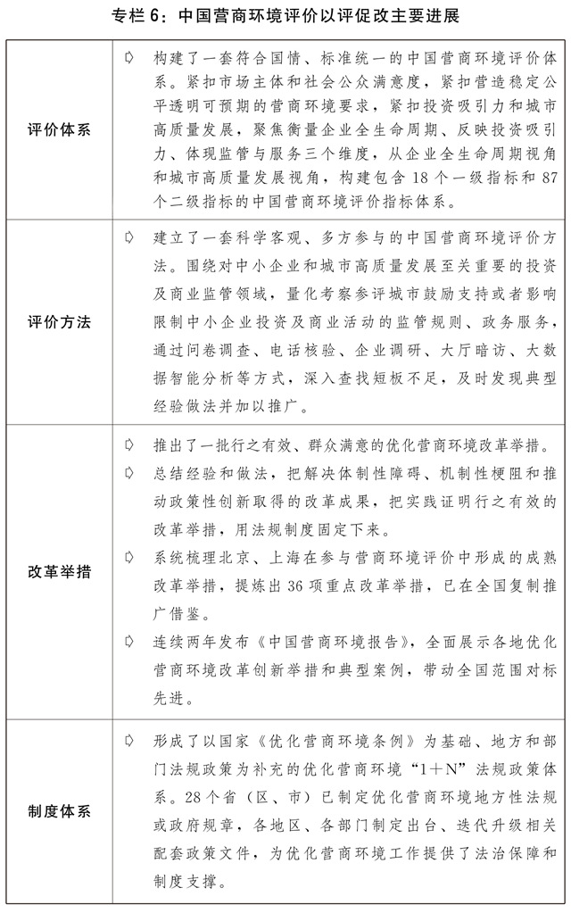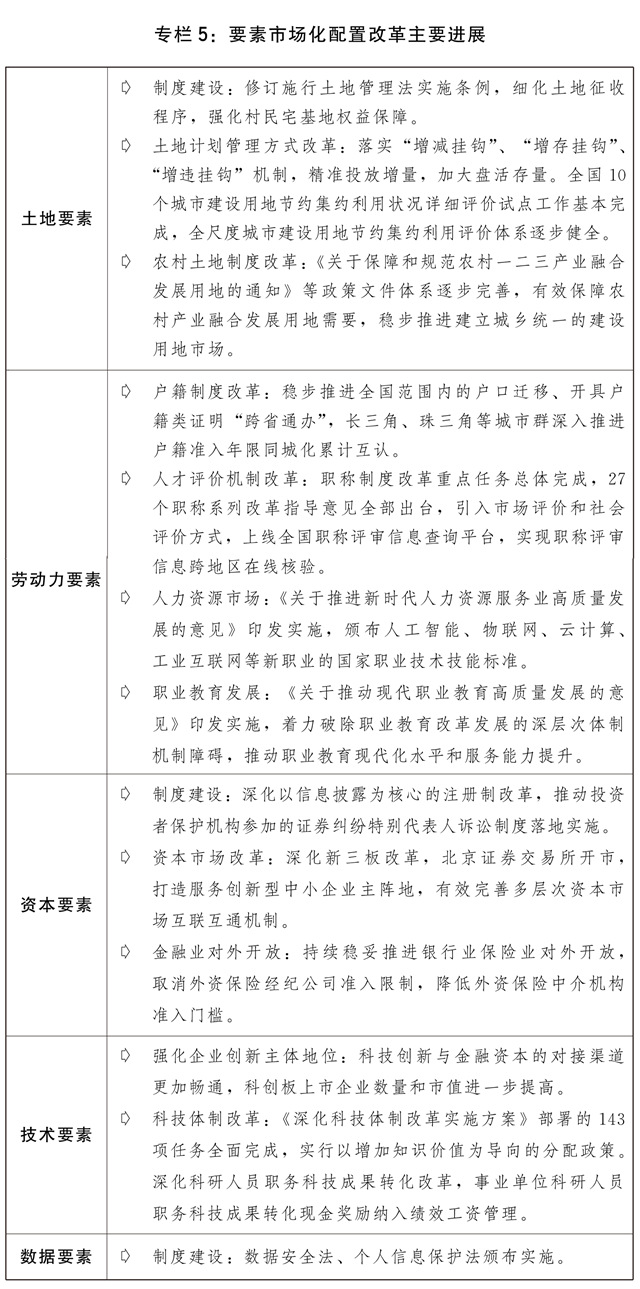 二是各类市场主体活力进一步激发。深入实施国企改革三年行动方案,加快国有经济布局优化和结构调整,国有经济进一步聚焦战略安全、产业引领、国计民生、公共服务等功能。国有企业混合所有制改革积极稳妥推进,近100户试点企业完成主体改革任务。持续为民营企业改革发展营造良好环境,20多部涉产权法律法规立改废,5847件涉产权规章规范性文件被清理。民营企业进入油气进出口、铁路、核电等领域,首条民间资本控股的杭绍台高铁建成通车。总结8个地方72条支持民营企业改革发展的典型做法并向全国推广,充分发挥示范引领作用。充分发挥各级融资信用服务平台作用,加强信用信息共享应用促进中小微企业融资。