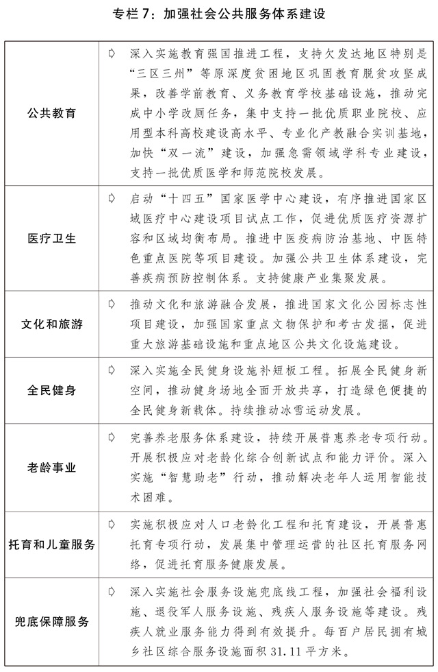 四是完善公共服务政策制度体系。分类推进基本公共服务均等化发展,推动服务重心向基层下沉,增加普惠性非基本公共服务供给。支持社会力量增加普惠性托育服务供给,进一步完善学前教育收费政策,推进普惠性学前教育资源扩容增效,推进儿童友好城市建设。推动义务教育优质均衡发展和城乡一体化,提升农村学校办学能力,依据常住人口规模增加城镇教育资源。继续做好义务教育阶段减负工作。加强县域普通高中建设。改善职业教育办学条件。推进高校“双一流”建设,加快经济社会发展重点领域急需学科专业建设、人才培养和科技攻关,完善产教融合政策措施。支持中西部高等教育发展,高校招生继续加大对中西部和农村地区倾斜力度。加强教师队伍建设,加大中西部地区教师培训力度。办好特殊教育、继续教育,规范民办教育发展。完善三孩生育政策配套措施,将3岁以下婴幼儿照护费用纳入个人所得税专项附加扣除,推动生育支持政策落地见效。贯彻落实积极应对人口老龄化国家战略,加强养老托育服务体系和健康支撑体系建设,维护好老年人合法权益。推动公立医院高质量发展,加快健全现代医院管理制度,深入推进国家医学中心、国家区域医疗中心建设项目和县级医院建设,加快完善分级诊疗体系,深化医疗服务价格、医保支付管理和公立医院薪酬制度改革。补齐妇幼儿科、精神卫生、老年医学等服务短板。持续深入开展爱国卫生运动、推进实施健康中国行动,倡导文明健康绿色环保生活方式。实施现代化疾控体系建设、国家重大传染病防治基地建设等工程,提升公共卫生防控救治能力。加快中医药特色发展。推动中华优秀传统文化创造性转化和创新性发展,促进出版、电影、广播电视、文物等事业高质量发展,推进公共文化数字化建设,提供更多公共文化产品。加强国家重大文化项目和国家文化公园建设,加强重要文化遗产和国家公园等重要自然遗产保护设施建设,全面提升革命文物保护利用水平,促进公共文化服务提质升级。推进国民旅游休闲加快发展,不断完善节假日制度。实施全民健身设施补短板工程,加强体育公园等全民健身场地设施建设。深化公共法律服务体系建设。